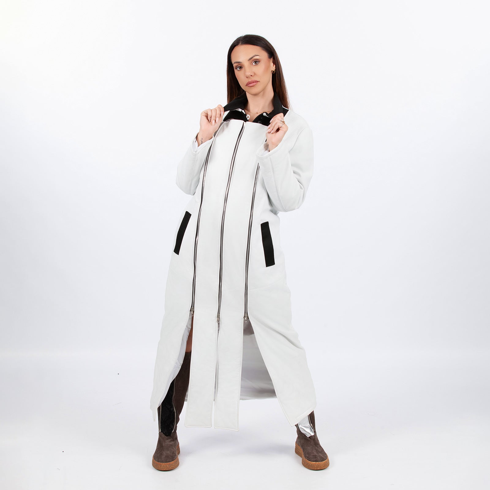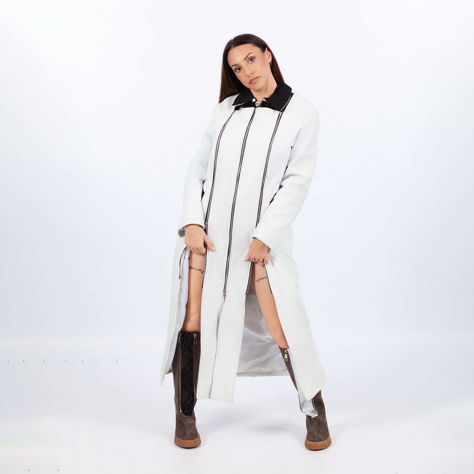 White faux leather coat and compensation bands. The coat can have two slits on the two legs using the zip bands for a sexy and sustainable look. The unique design includes removable zip strips. The compensation bands are made of faux leather.